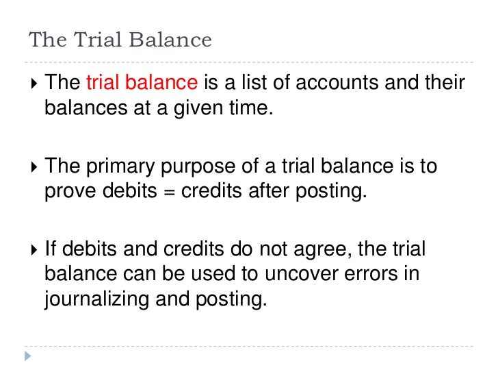 Trial balance represents a summary of all ledger balances and, therefore, if the two sides of the trial balance tally, it is an indication of this fact that the books the trial balance is usually prepared on a loose sheet of paper. Remington repair services trial balance april 30, 2014. The post trial balance occurs after balance day adjustments. Equality of debit and credit balances in the ledger. The trial balance lists every open general ledger account by account number and provides separate debit and credit columns for entering account an error has occurred when total debits on a trial balance do not equal total credits.